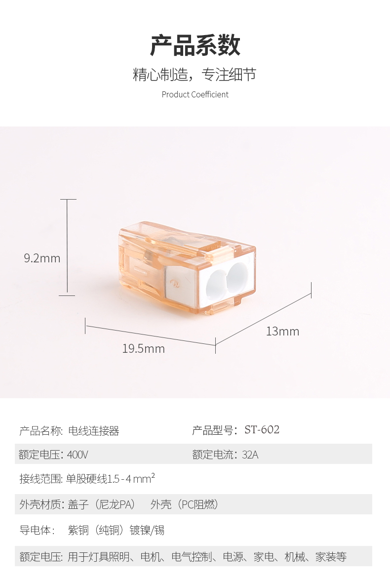 Electrical performance Rated voltage:400V Rated current:32A Wire diameter:1.5-4mm2 Dielectric Strength:AC2500V/1Min Mechanical properties Ambient temperature:-40℃~+105℃ Strip length:12mm Size:19.5*,9.2*,13.1 Material and Plating Plastic parts:PC,UL94V-2 Reed:Stainless steel Contact material:Electrolytic copper,nickel and tin plating