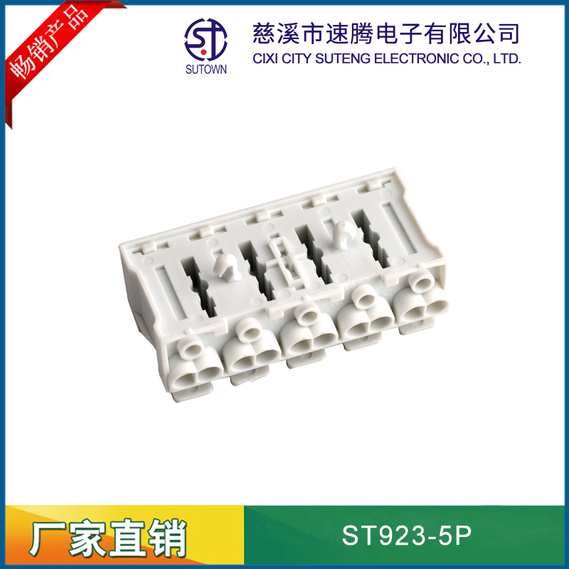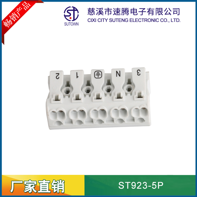 Product name:923 terminal block 5P Product model:ST923-5P Apply to wire:Hard and soft conductor 0.75-2.5mm^2 Technical parameter:Rated voltage:400V Rated current:24A Product size:50*,25*,21mm(Depth,width,hight) Product materials:Crust:Modifled nylonPA66 The diversion of article:Electrolysis copper (surface of the tin) Spring:301 Stainless steel