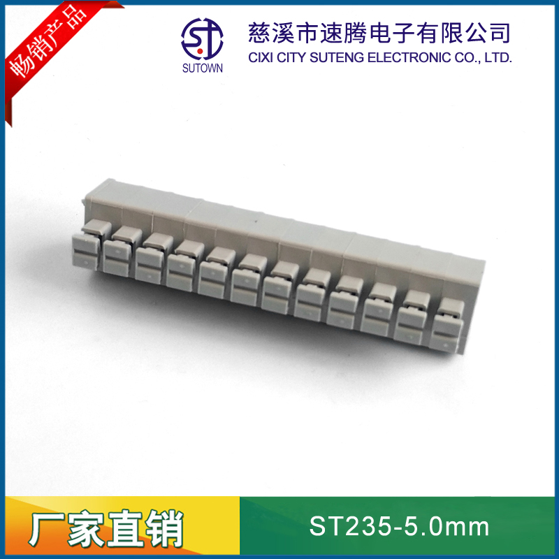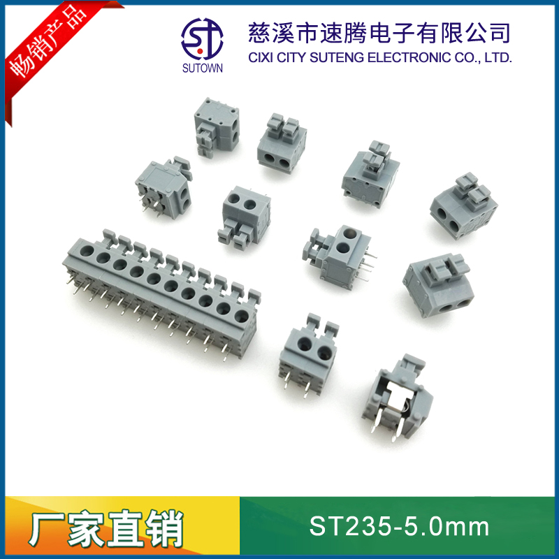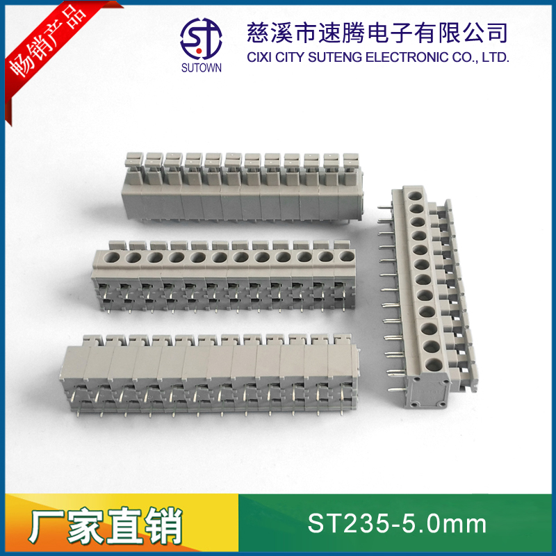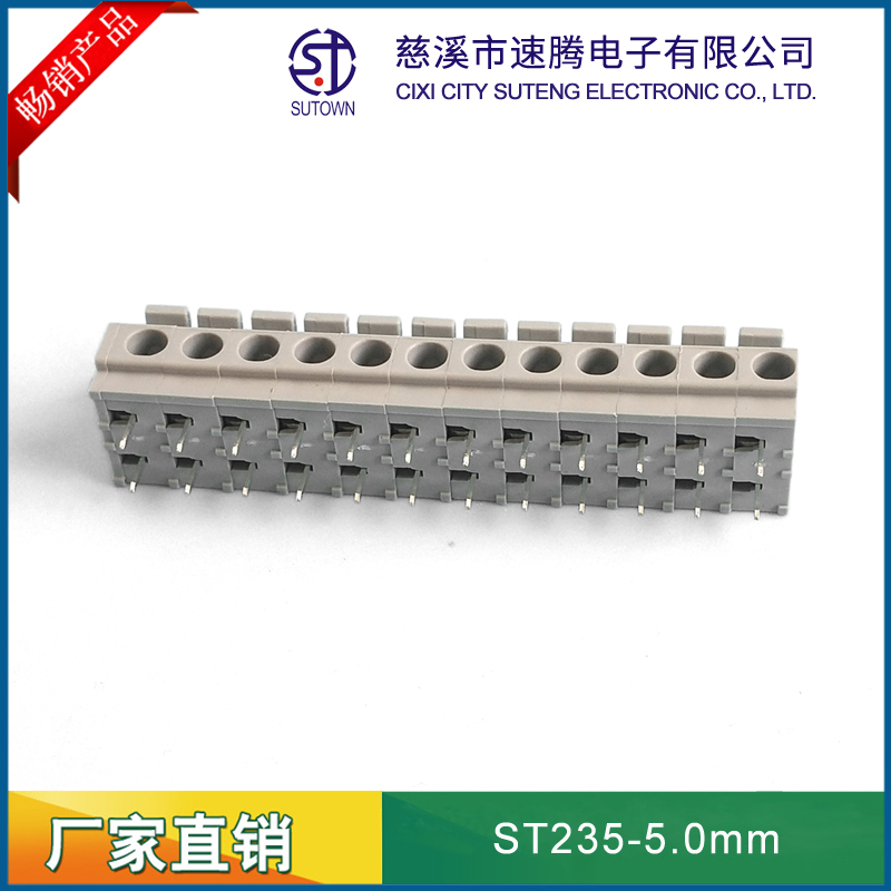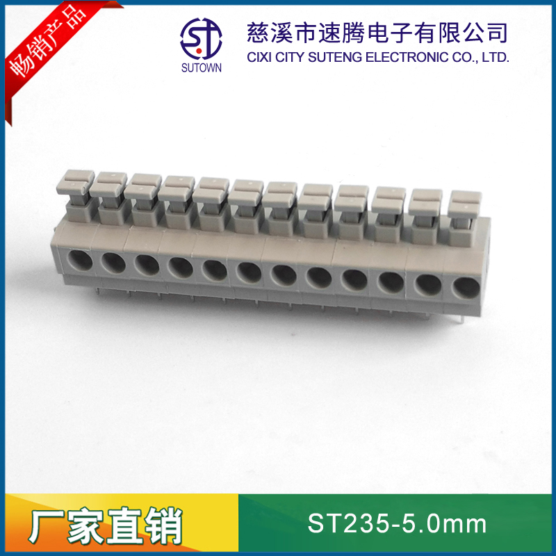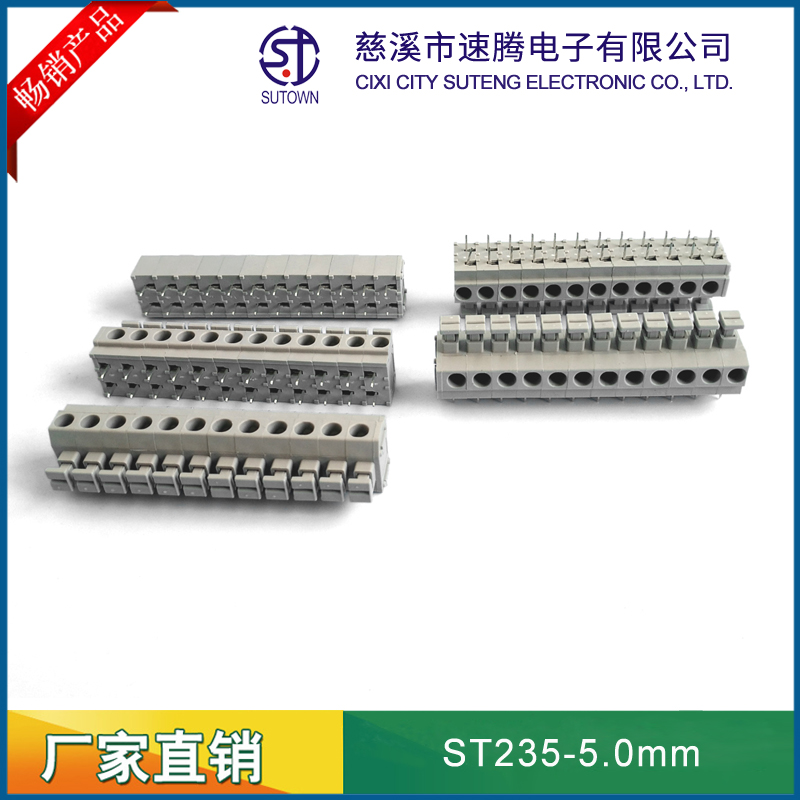 Material and Plating Spacing:5.0mm Plastic parts;PA66,UL94V-0 Terminal:Brass,Tin plating Spring:Stainless steel Electrical performance Rated voltage:300V Rated current:5A Ambient temperature:-40℃~+105℃ MAX Soldering:+250℃,5s Withstanding Voltage:AC2000V/1Min Contact resistance:20mΩ Insulation resistance:5000MΩ/1000V Wire diameter:22-18AWG 1.5mm2 Torque:0.4Nm Strip length:8-9mm