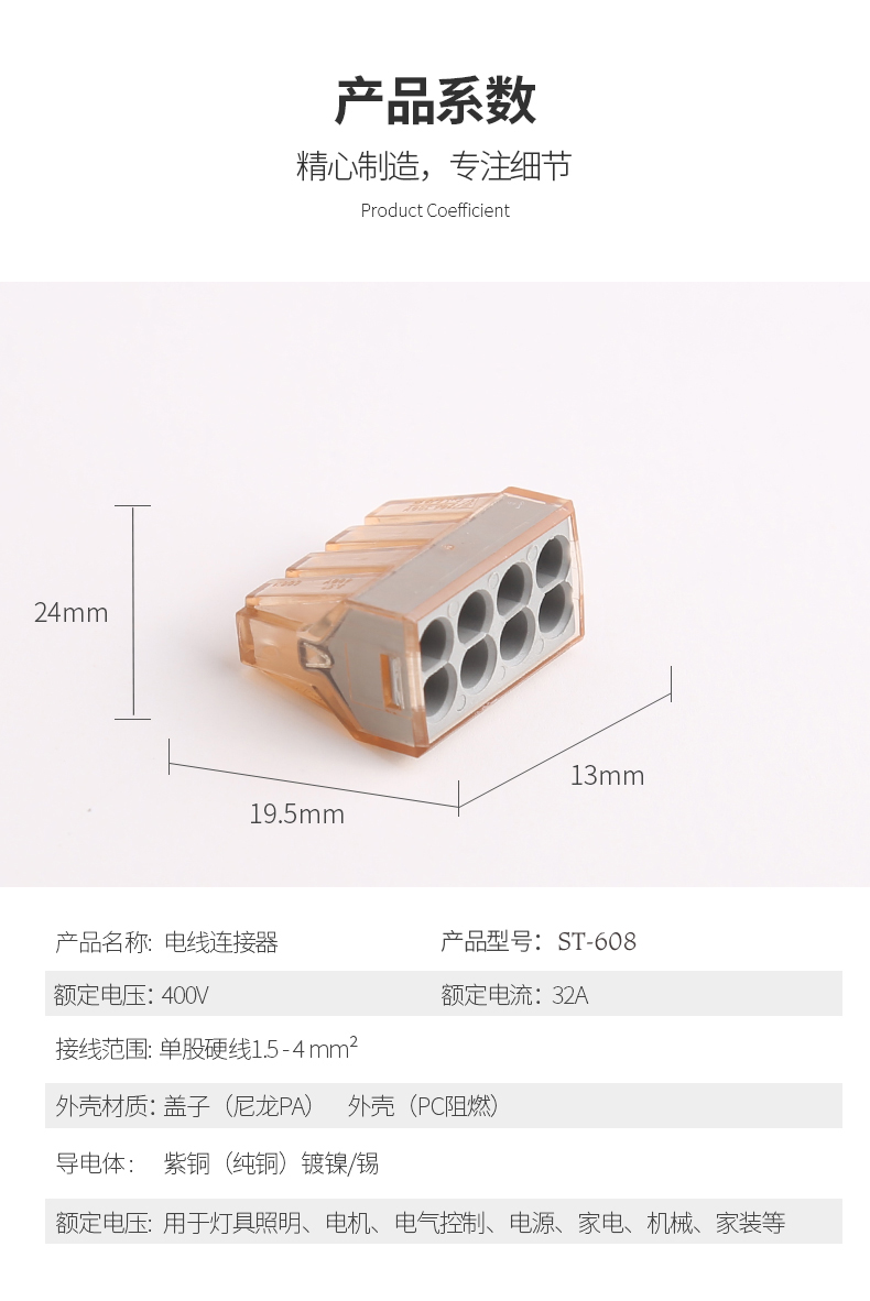 型號: PCT-608間距: 1.5-4mm²額定電流:400A額定電流:32A導(dǎo)線線徑:1.5-4mm²耐電壓:AC2500V/1Min機(jī)械性能環(huán)境溫度:-40°C~+105°C剝線長度:12mm尺寸:19.5*,9.2*,13.1材質(zhì)及電鍍塑件:PC,UL94V-2彈片:不銹鋼觸點(diǎn)材料:電解銅鍍鎳錫